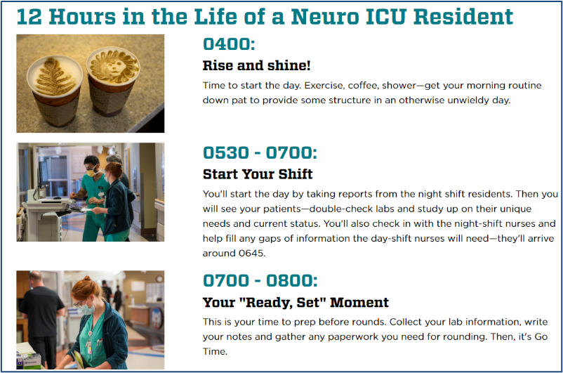 In 2021, the University of New Mexico Health Sciences Center worked with Stamats to create this award-winning timeline, A Day in the Life of a Neuro ICU Resident, to visualize a neurology trainee’s daily schedule.