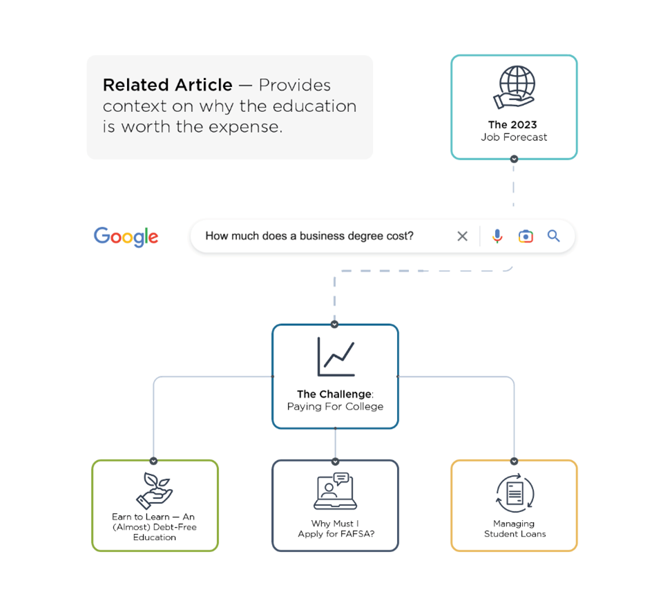 A specific brand, product, service, or solution is never at the top of a funnel. At the top of the funnel sits a far more basic question. For higher education, that question is some form of “Do I need or want to continue going to school?” Deciding on degree paths and schools is a mid-funnel activity that comes several steps after this top-of-funnel question is answered.