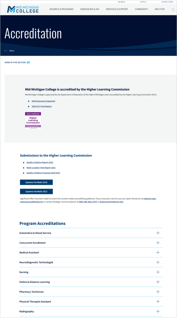 Some schools create a page that lists not only the primary accreditation statement, but links to accredited programs as well. This can make it easier for the marketing team to monitor and maintain: