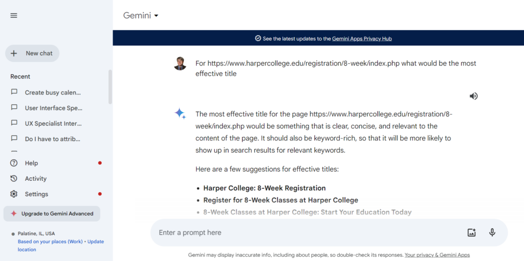 Harper’s plan: Use Google Gemini, formerly known as Google Bard, to generate copy for job-specific courses and certifications, e.g., truck driving, coding in Python, prepping as a veterinary assistant, or earning a real estate license. Patrick tested and chose Gemini because he had confidence Google’s search expertise would prove valuable.