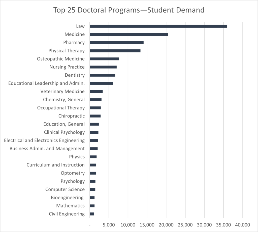 Not surprisingly, the largest volume doctoral programs are in law, health science occupations, and education. STEM and business programs are also among the top 25 highest-volume programs in the U.S.