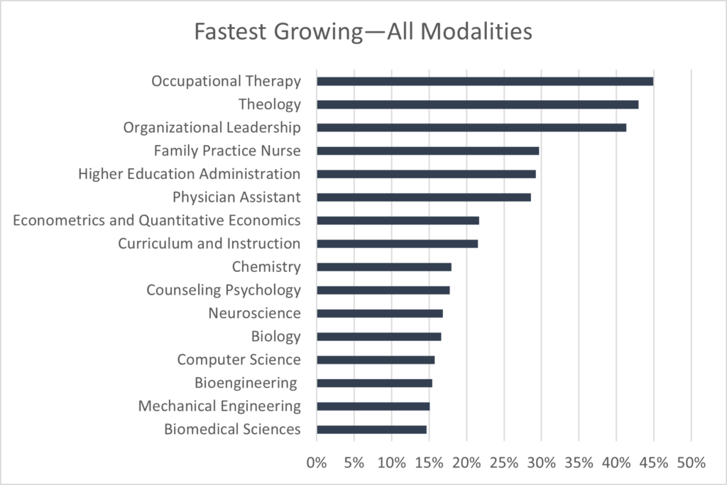 - Organizational Leadership – 3rd fastest growing program at the doctoral level in the U.S.; providers growing most rapidly offered the program in the distance format.