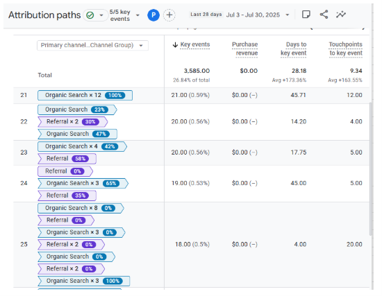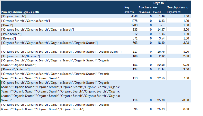The Attributions Paths report built into GA4 (Advertising / Attribution Paths) is very interesting and useful, yet very limited. You cannot filter the report in GA4 to focus on one channel or campaign, and the Days to Convert and Touchpoints to Convert metrics are not available in Looker Studio.