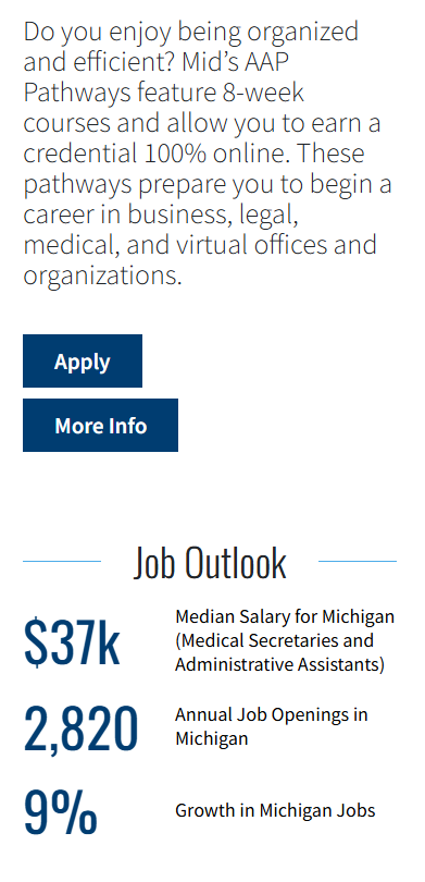 These content hubs give students a broader view of different career fields, such as related programs a student might not have considered. Across the board, Mid’s content uses simple, straightforward language so students can easily understand how to use the guided pathways and how they can benefit from them.