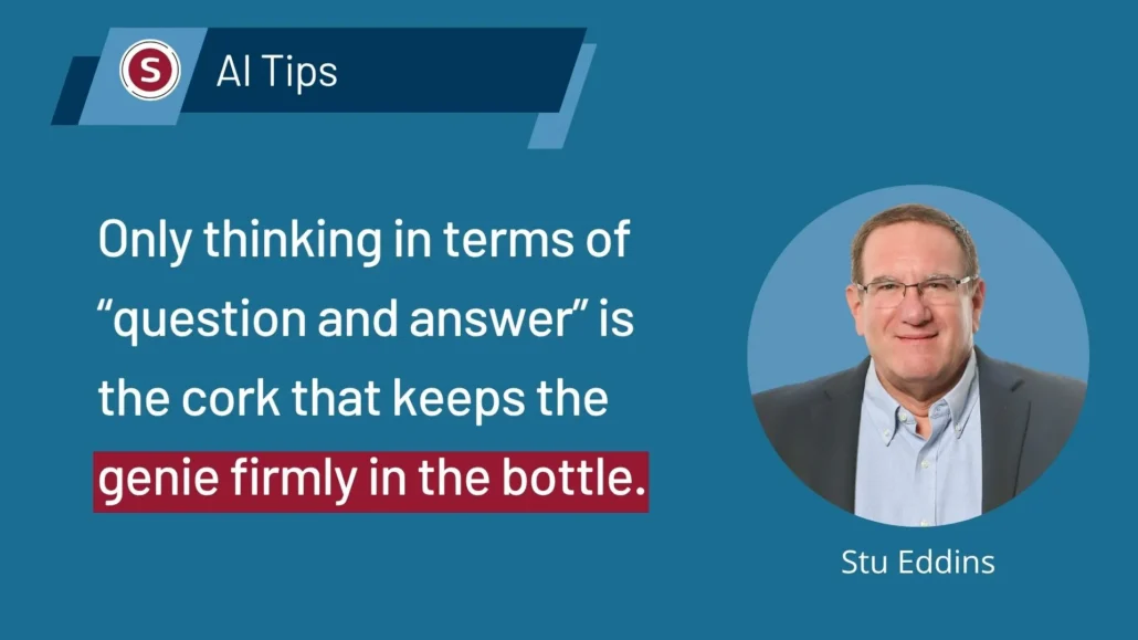 A recent study found that 80% of AI chatbot interactions consist of a single question and a single answer. Today’s users ask nothing more of AI chatbots than for them to be “super search engines.” This type of usage isn’t wrong; sometimes you need an answer. But it isn’t leveraging anywhere near the full potential of AI. Only thinking in terms of question and answer is the cork that keeps the genie firmly in the bottle.