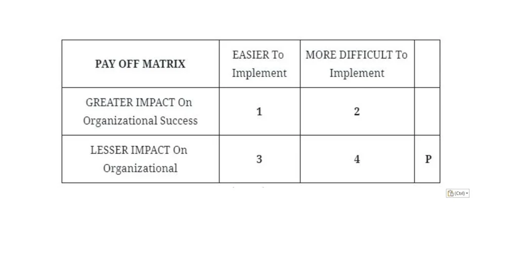 - Quadrant 4: Activities that are more difficult to accomplish but have less impact on organizational success