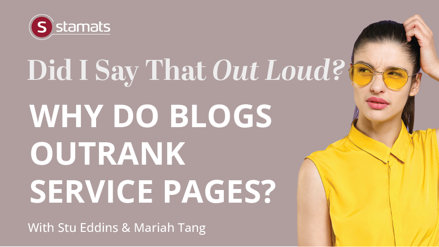 Stu: Yeah, you know, we were looking for some help some help us some house cleaning firm for my parents. And there’s more transactional intent with that. So yeah, we were going right to the content pages to see what people did. But we were also paying attention to reviews. We were paying attention to the websites, blog content in this case, because it described happy customers and what they were getting it described in depth, which means you know, we clean your kitchen. Great. What does that mean? And in the blog content, a couple of them actually talked about what they clean for food safety, and put it in that context, as opposed to we wiped out your counters and cupboards. They gave a little more insight into it. We chose the one that had more supporting content, because for one thing, they gave comfort with their answers for the other thing. They also gave us something as as far as a mark, we’d say, Hey, you said you do this. I’d like to see evidence that this is really going on. This is what I expect now. So it can be helpful in that regard as well. Anyway, so we’ve talked about why blogs outperform regular content. We’ve looked at why that came be a very good thing. We’ve also discussed only briefly, the need to interconnect all this stuff when we’ve talked about interconnecting your website content on other podcasts that talk about it all. Yeah. But it is critically important to create not just the content, but the internal web of your website that links all this stuff together. But connective tissue that says, You’ve read this now do that, or you read this, here’s some more supporting information, then go do that. All of that is tied together. And yes, that’s why often blog content will outrank regular content on the website for a given theme.