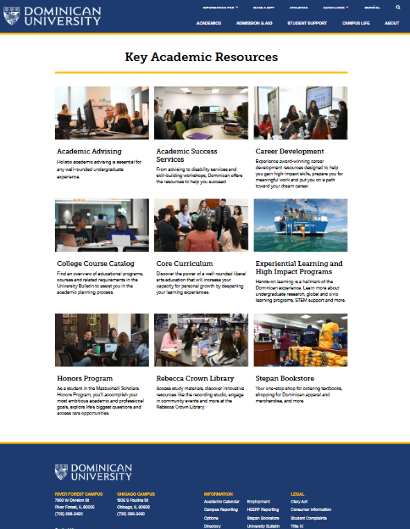 Dominican University’s website design was dated and inflexible. It relied heavily on left navigation and lengthy, inconsistent menu labels. Overall, the pages lacked a compelling story to connect future Stars to the campus community.