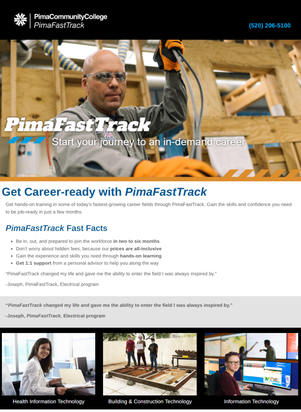 For Pima’s FastTrack programs, enrollment doesn’t follow the traditional academic calendar. New cohorts start throughout the year, which meant the marketing approach had to be just as agile.
